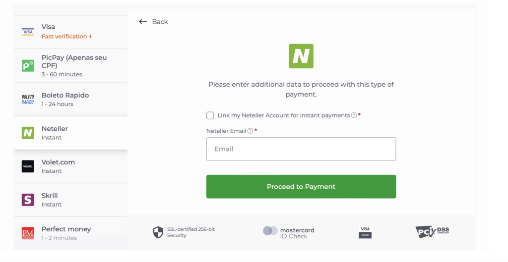 Para realizar un depósito con un monedero electrónico, selecciona el importe del depósito e introduce la dirección de correo electrónico de tu monedero electrónico en el campo. Serás redirigido a la página web del monedero electrónico para completar la transacción. El importe del depósito se abonará en tu cuenta de IQ Option poco después.