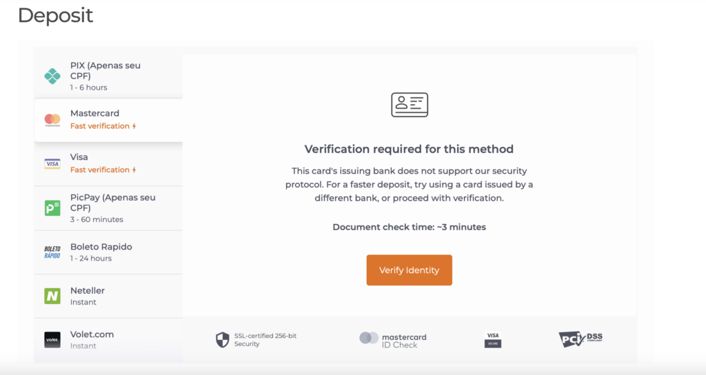 Asegúrate de subir tu documento de identidad para su verificación antes de utilizar el método de depósito con tarjeta bancaria. Si has olvidado verificar tu identidad, verás un recordatorio en la página de depósito. Lee nuestra guía completa de Verificación en IQ Option para obtener instrucciones.